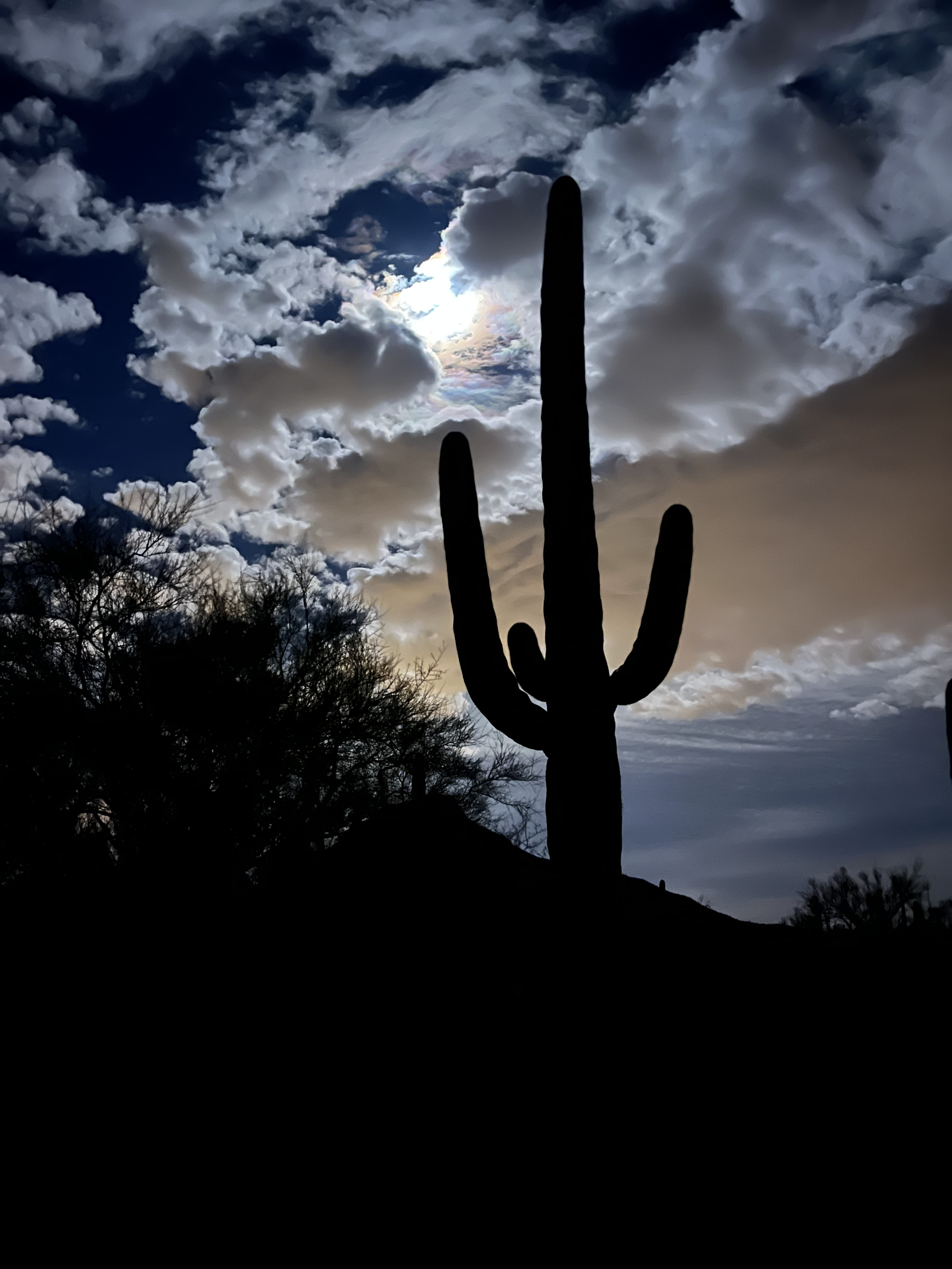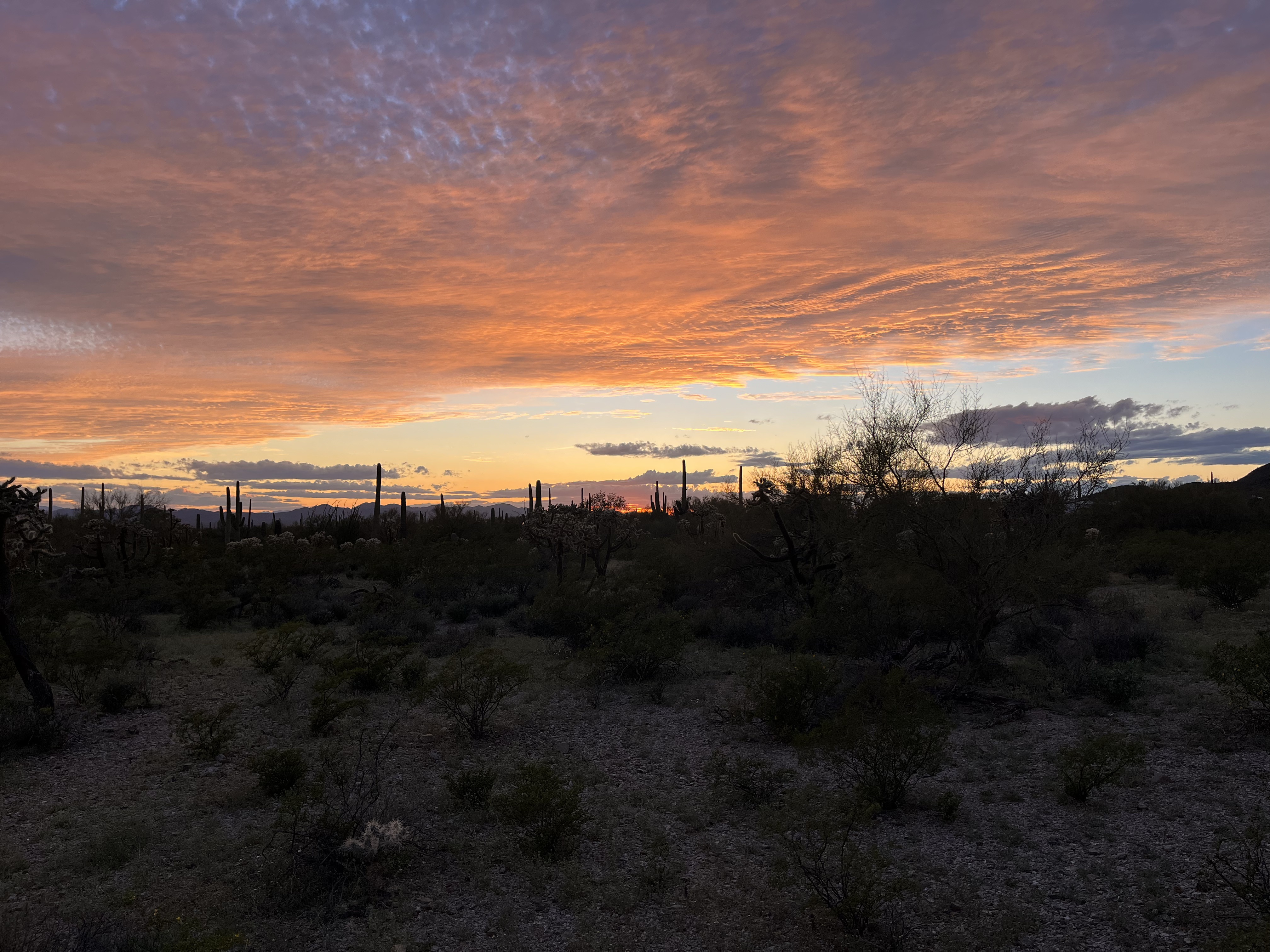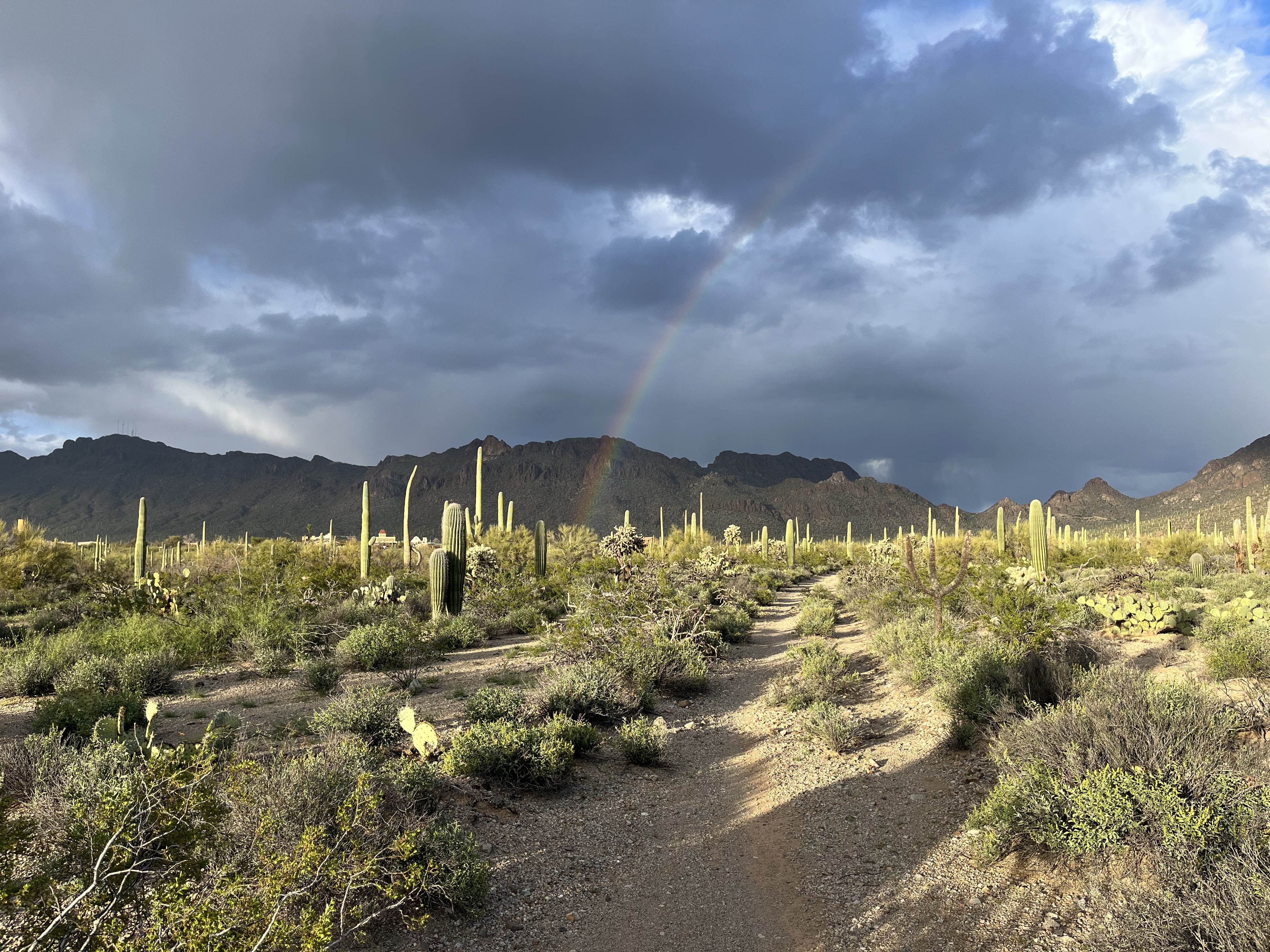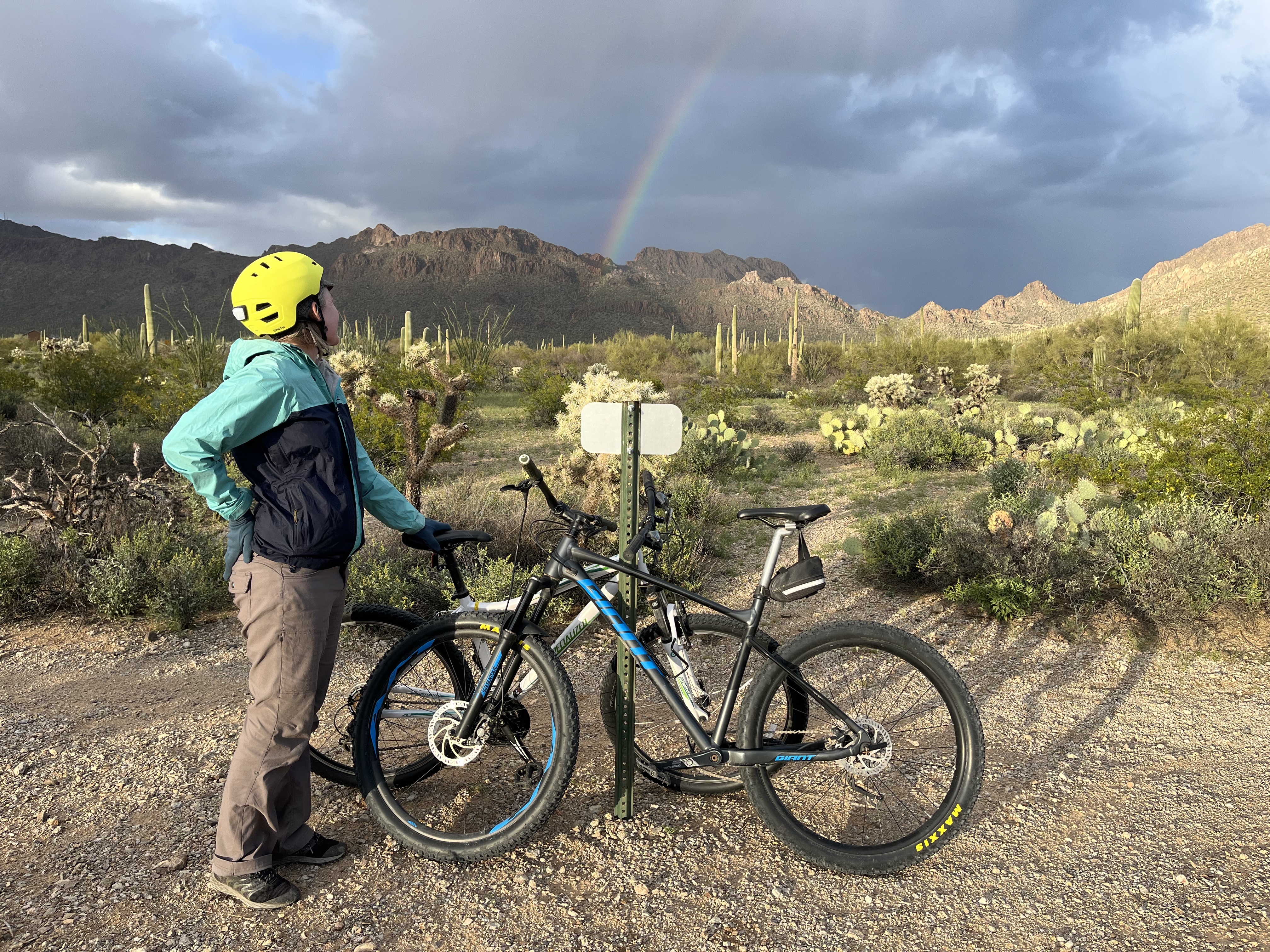 It poured rain overnight and we woke up to chilly temperatures and wind. Breakfast consisted of leftover Mexican pastries and coffee. I spend the morning curled up with a blanket in the camper reading and writing while Jocelyn went for a walk. In the afternoon we met up with a couple more friend’s of Jocelyn’s who also live in the Tuscon area for a hike. The hike we did was called Brown Mountain. It started from the campground, wound up to the top of a ridge with great views of Saguaro NP and Tuscon down below, and then looped back around. I got a partial answer to a nagging question I’d had about Saguaros on this hike, that being when and why do they grow arms? The answer is that they don’t get them until they are about 60 years old, but no one really knows why they grow them. I also learned that barrel cactus will almost always lean to the South making them a good way to tell direction if you’re ever lost in the desert. The weather for the hike was just about perfect, but later in the day it turned windy and a bit rainy again. Our final activity of the day was a bike ride on some other nearby trails where we saw a beautiful desert rainbow and another spectacular sunset.