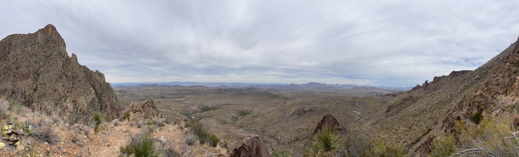 The trail revealed itself gradually, dropping through classic Chisos terrain. Mountains rose around us while a narrow notch in the peaks framed the desert plains below like a natural window. Though we descended quite a ways, the trail’s mild switchbacks made for comfortable hiking. A couple miles in, the landscape transformed as we entered a steep canyon filled with oak groves, Mexican Buckeye, and Texas Lignum in bloom – a welcome respite from the exposed desert.