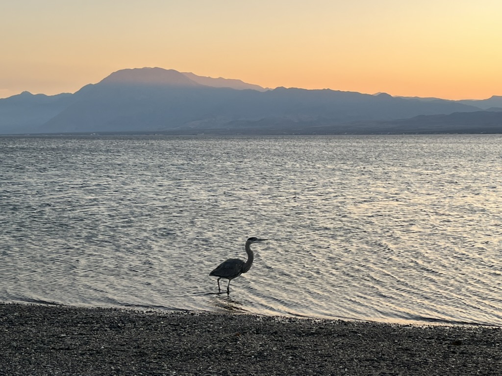 Bahia de Los Angeles and Playa La Gringa are beautiful. Clear blue water contrasted against the red and brown desert landscape of the surrounding mountains and offshore islands. Our first night we arrived to a feeding frenzy of brown pelicans. They would fly up about 20 feet and then tuck their wings and point their huge long beaks straight down and plunge into the water like a missile, gulping down their catch as they came back up. It was quite a welcoming party. I’ve since learned that brown pelicans are the only pelican species that dive like that.